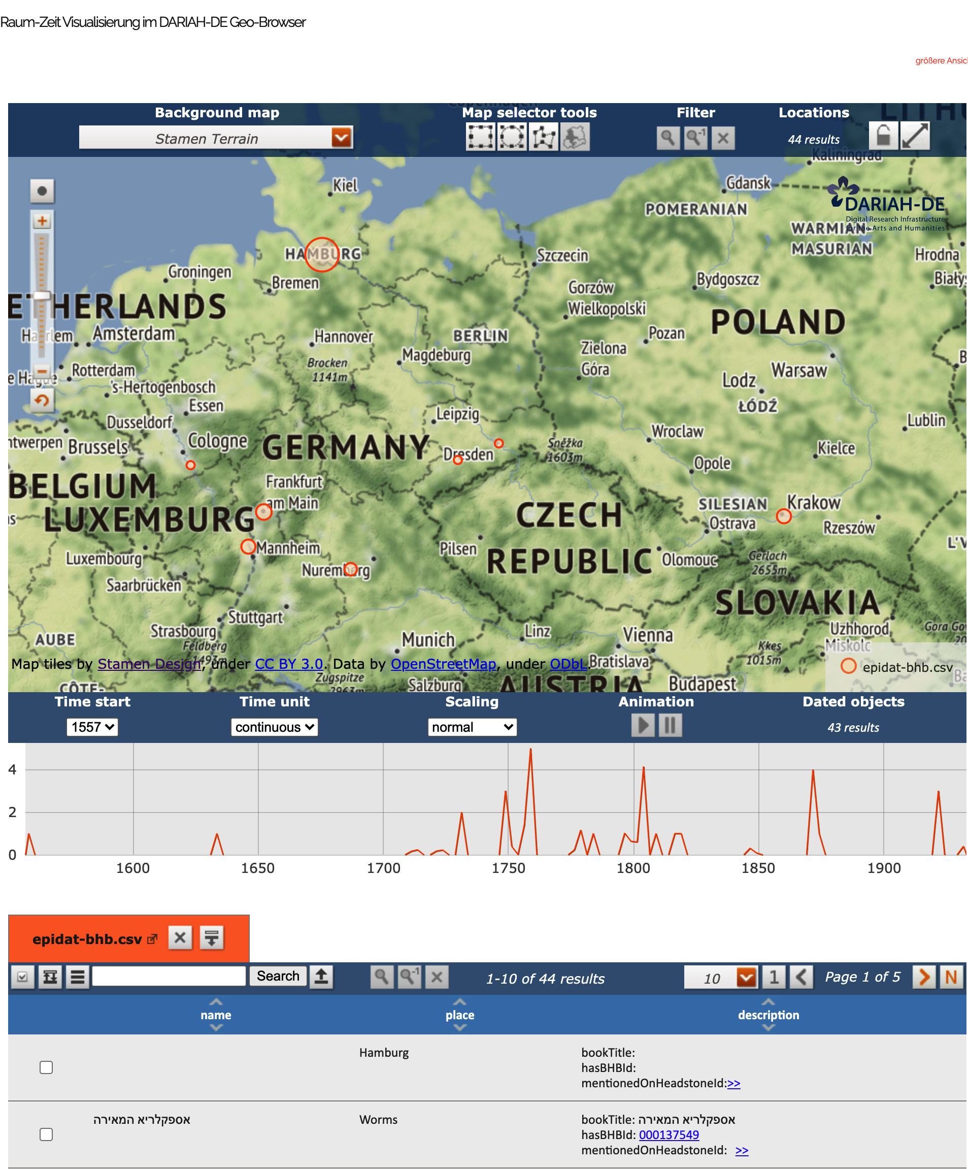 Particularly in the 18th and 19th centuries, it happens that epitaphs list books written by the deceased. From time to time, descendants also refer to books written by an ancestor. About 50 books are listed and presented in the spatiotemporal visualisation in the DARIAH-DE Geo-Browser.